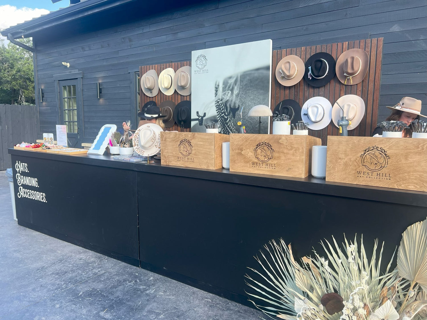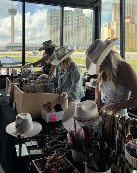 Add an unforgettable experience to your event with our San Antonio Hat Bar—delivering custom cowboy hats and fedoras directly to your event. Serving San Antonio, New Braunfels, Boerne, and the surrounding areas, our team of 25+ stylists design hats for any event. Each hat sold helps fuel our mission of giving back, with a portion of proceeds supporting charitable causes.