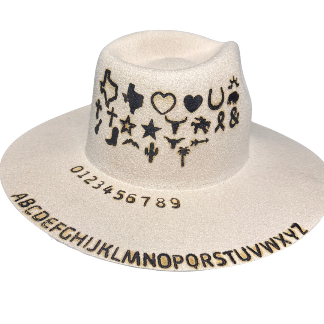 Notes example: 'Longhorn crown E, Cross under brim S' will brand the "Longhorn symbol" on left side of crown, and the "Cross symbol" under the brim on the back.