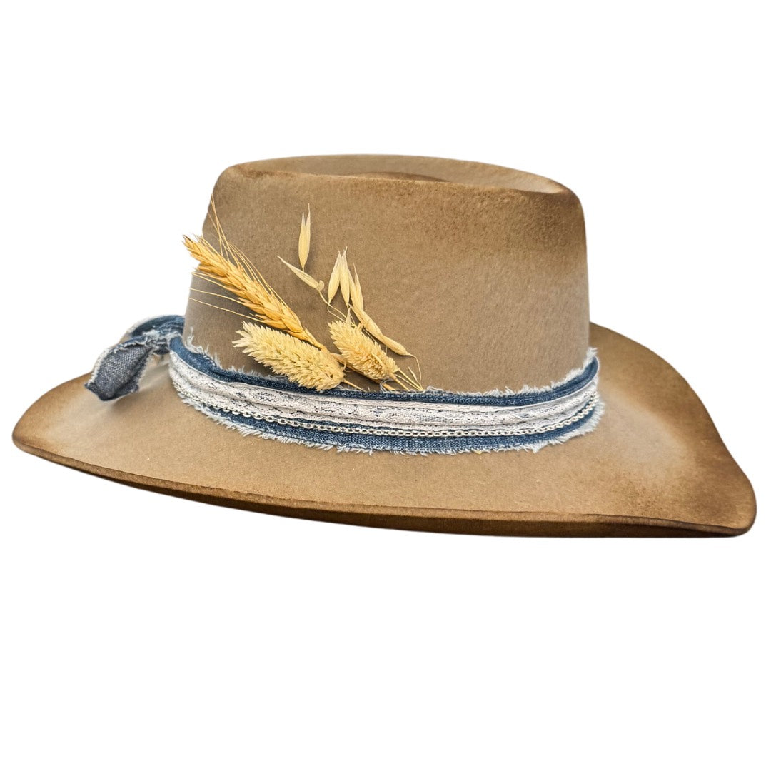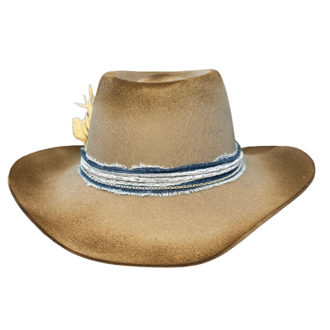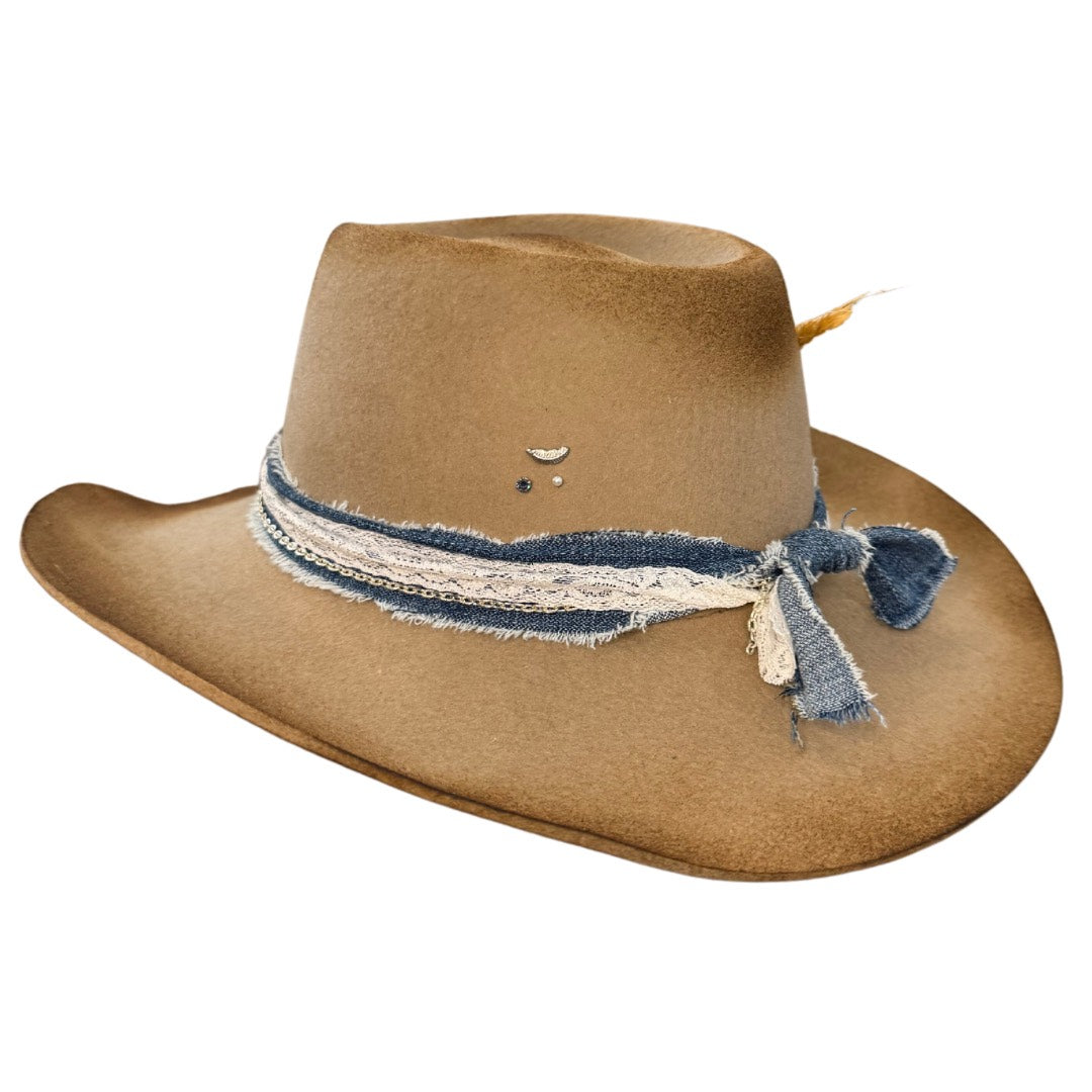 - Taupe wool rancher style hat with a round pointed crown and a stiff slightly upturned brim