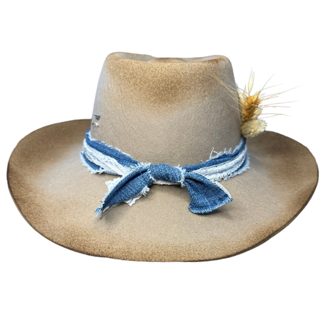 - Band is a 1.5” scrunched ripped denim knotted on the south side (back)