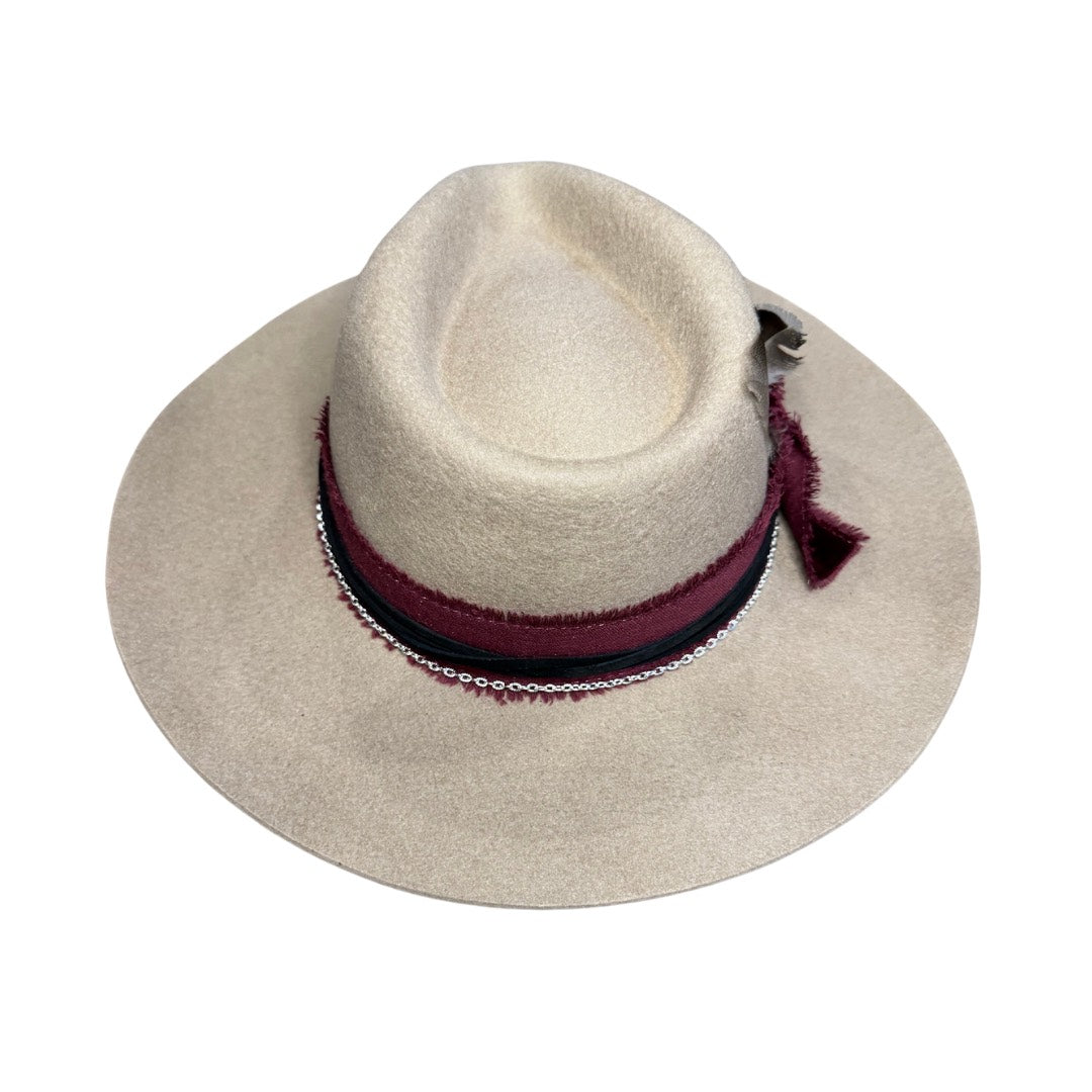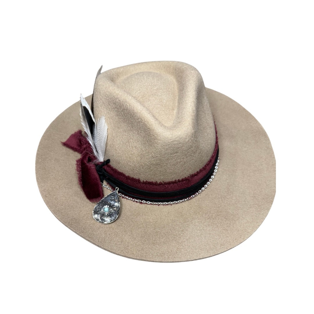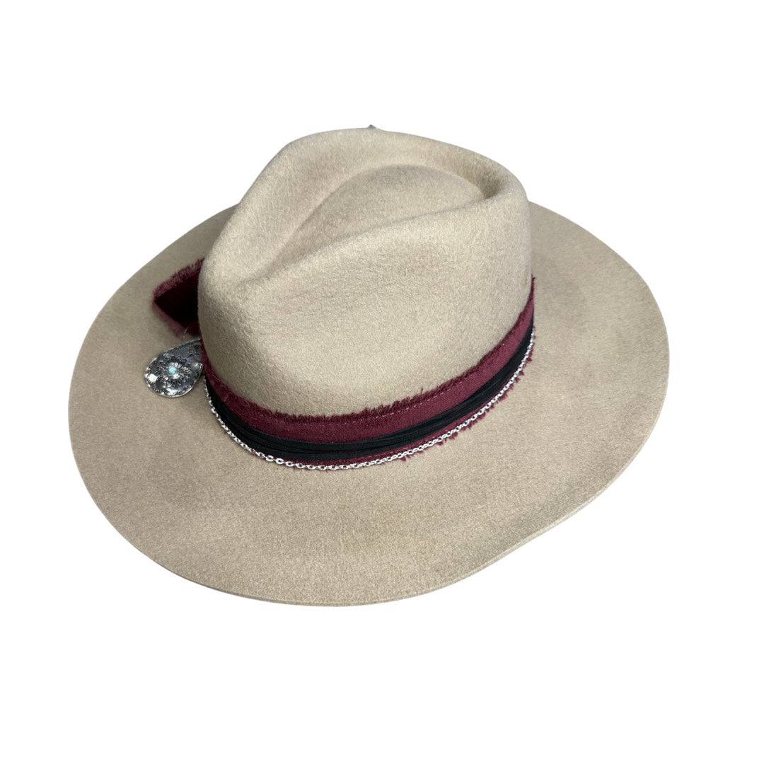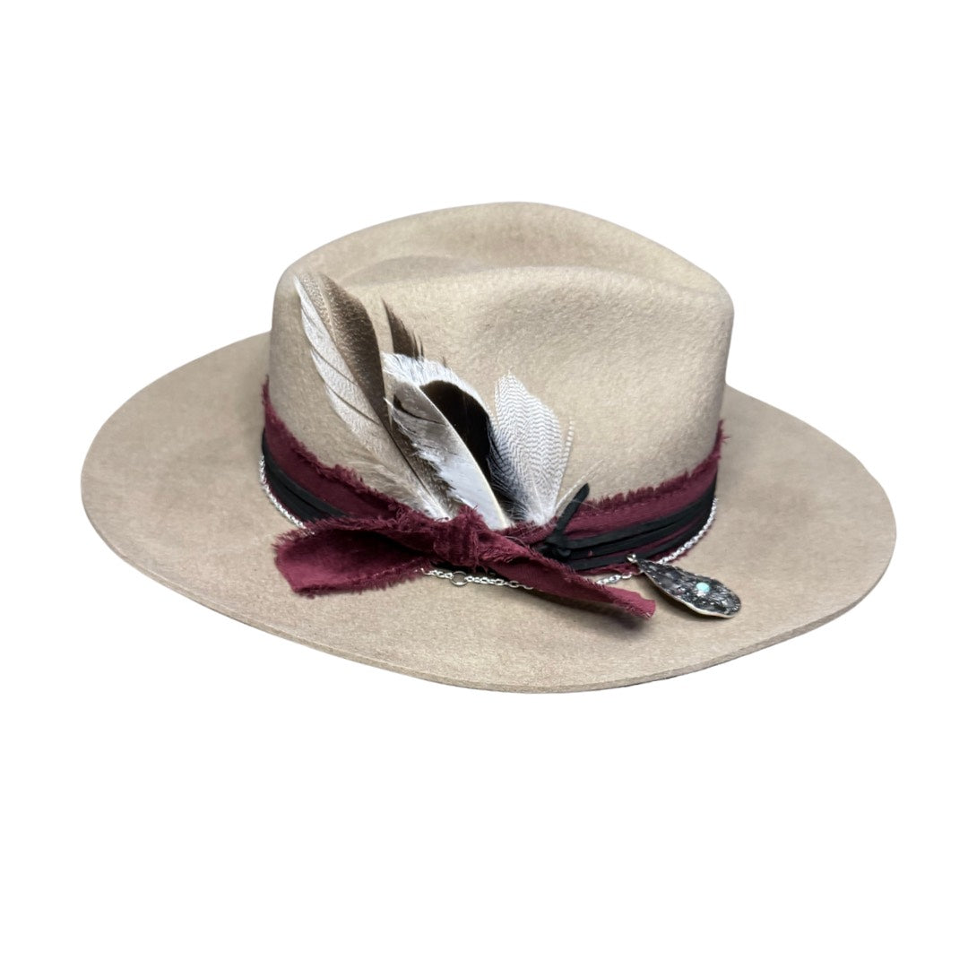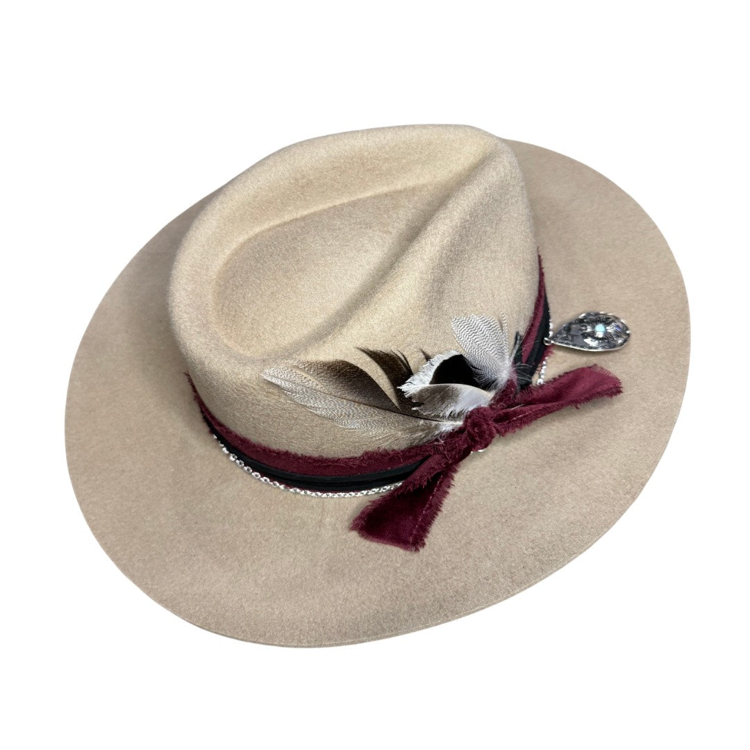 - Taupe wool rancher style hat with a round pointed crown and a stiff slightly upturned brim