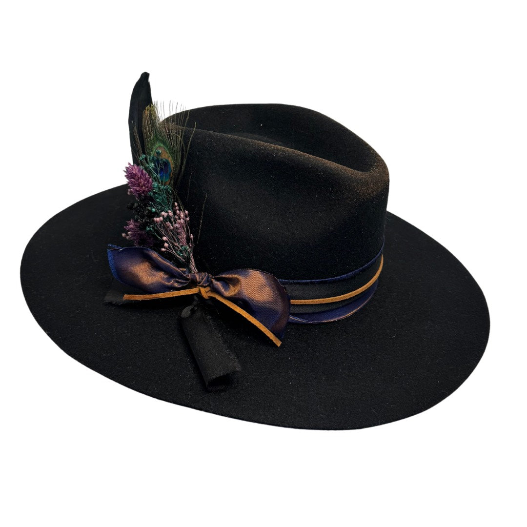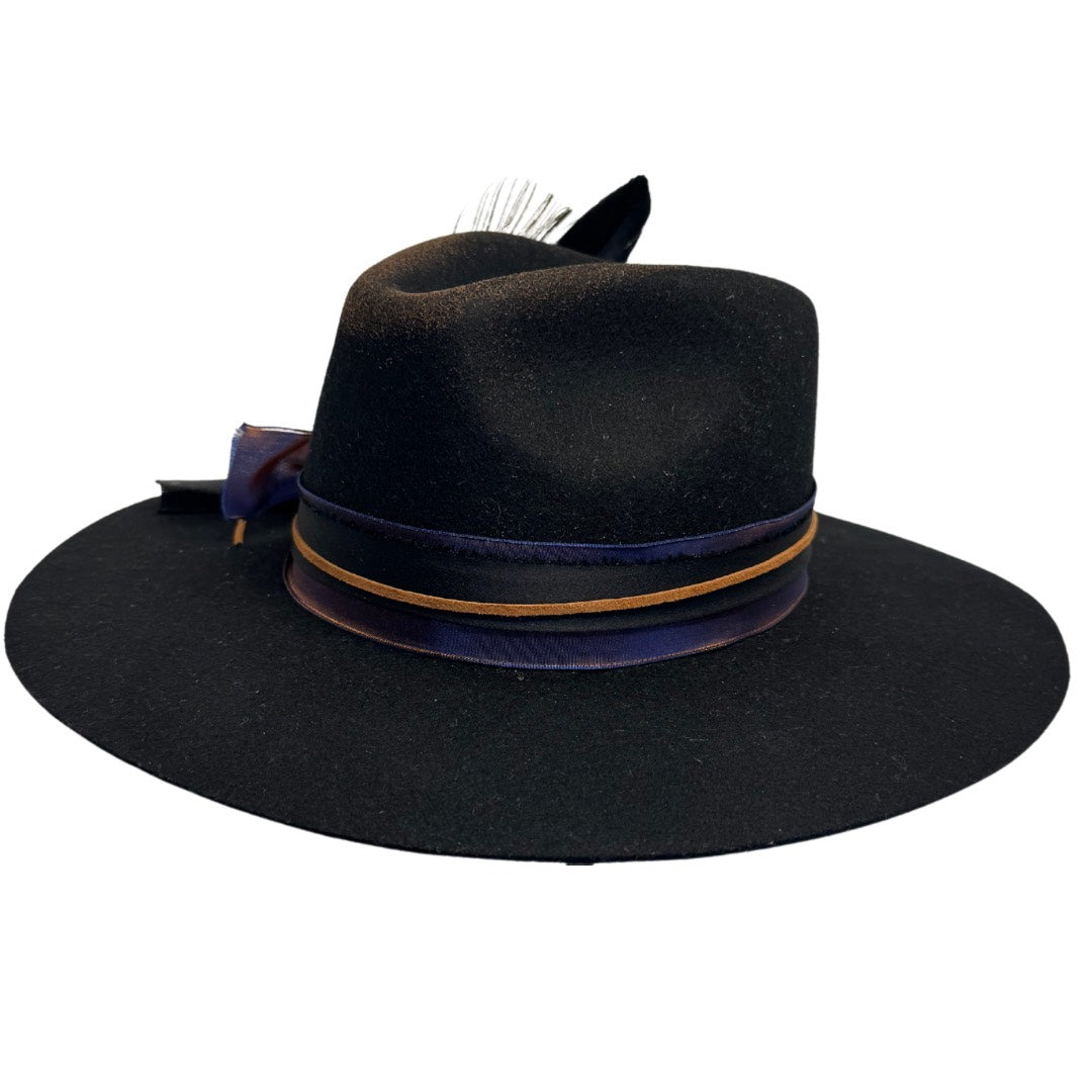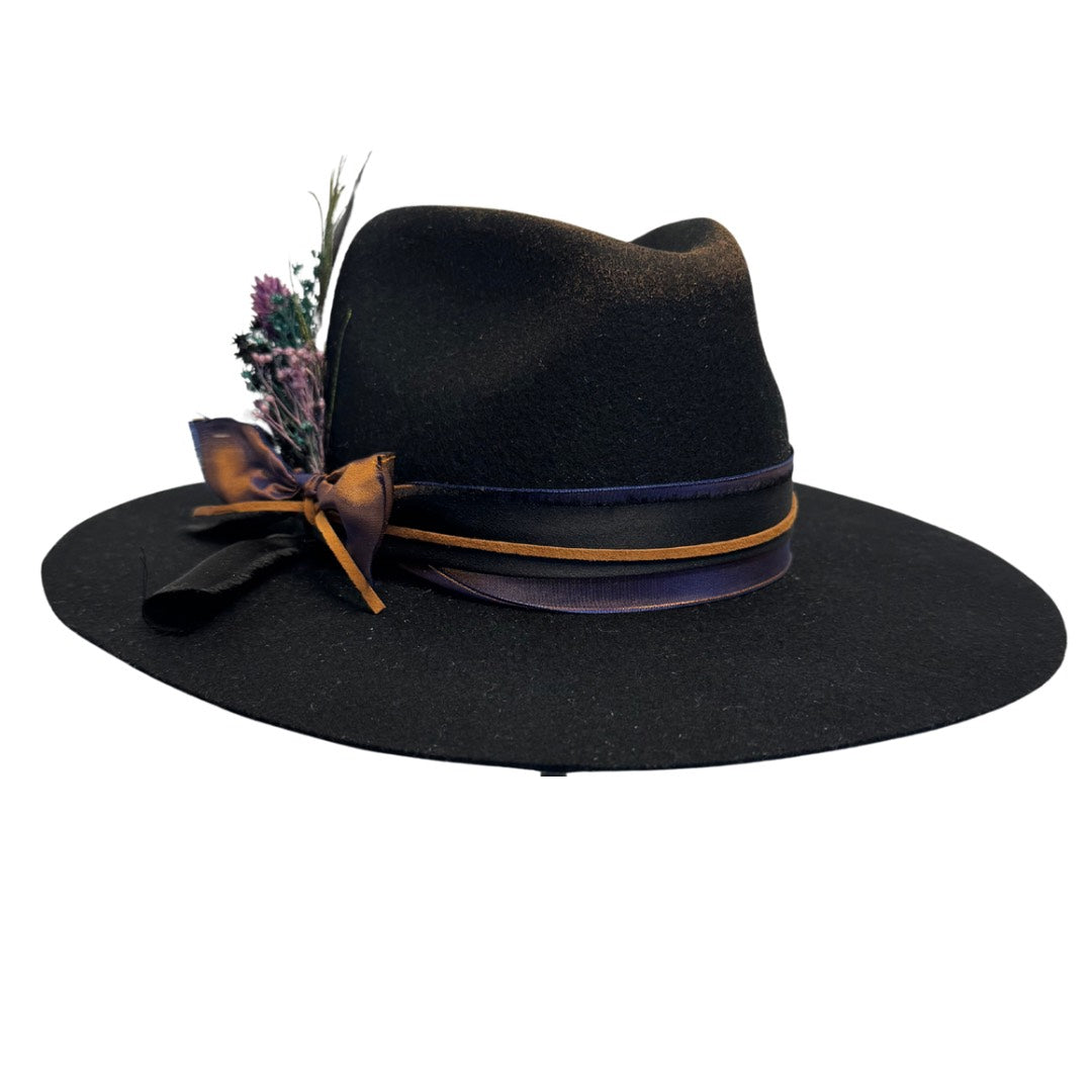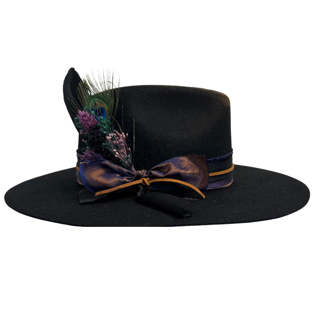 - Dark purple taffeta band with a copper brown shimmer knotted on the east side