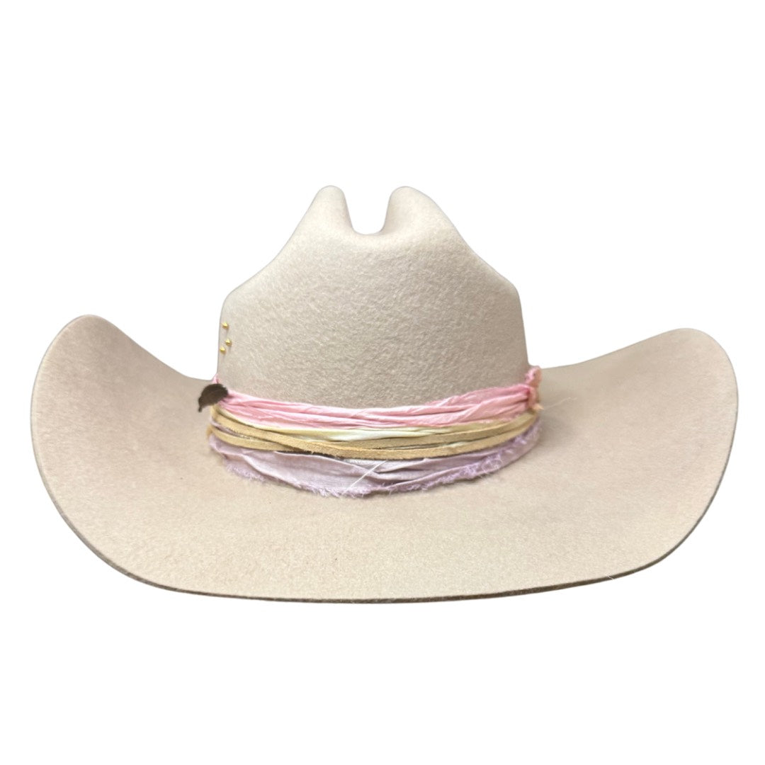 - Silk sari ribbon yarn band in tan, lavender, and pink knotted in the back