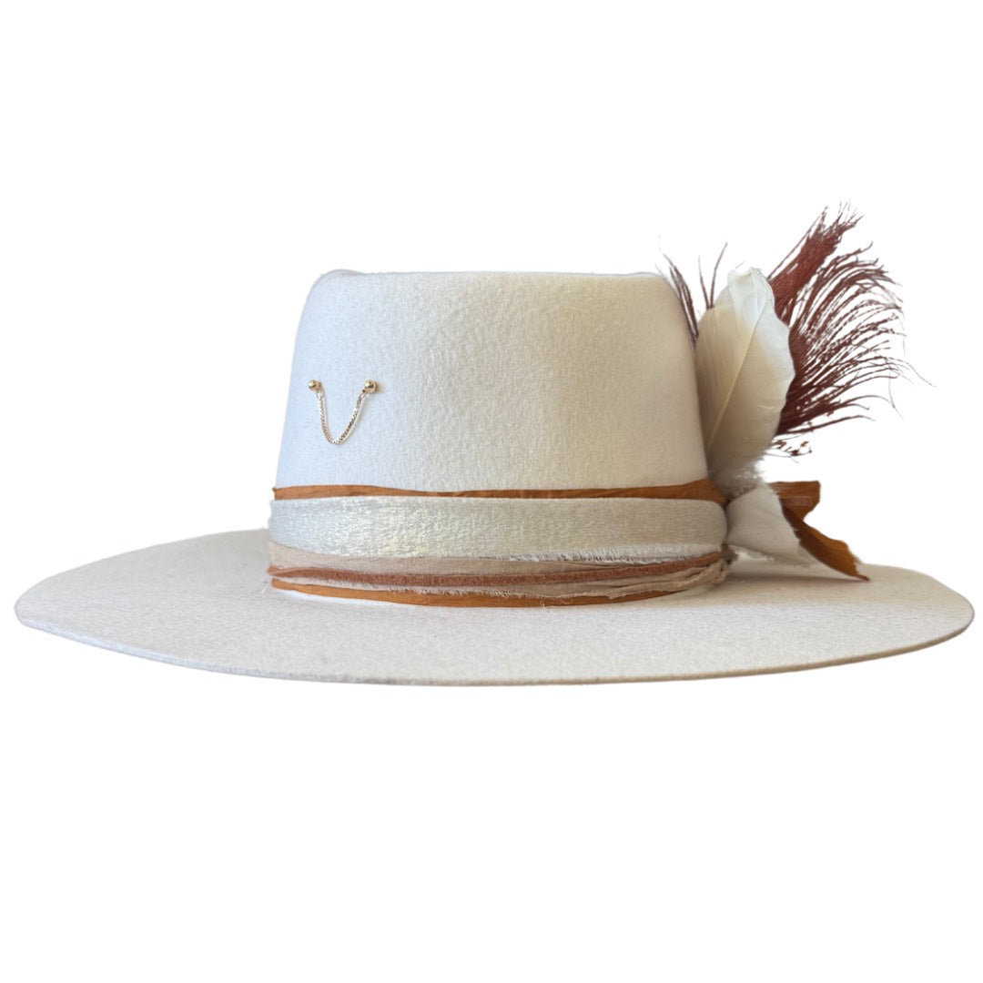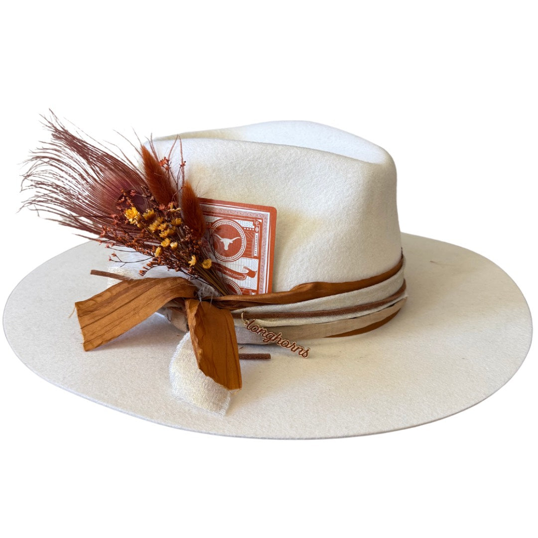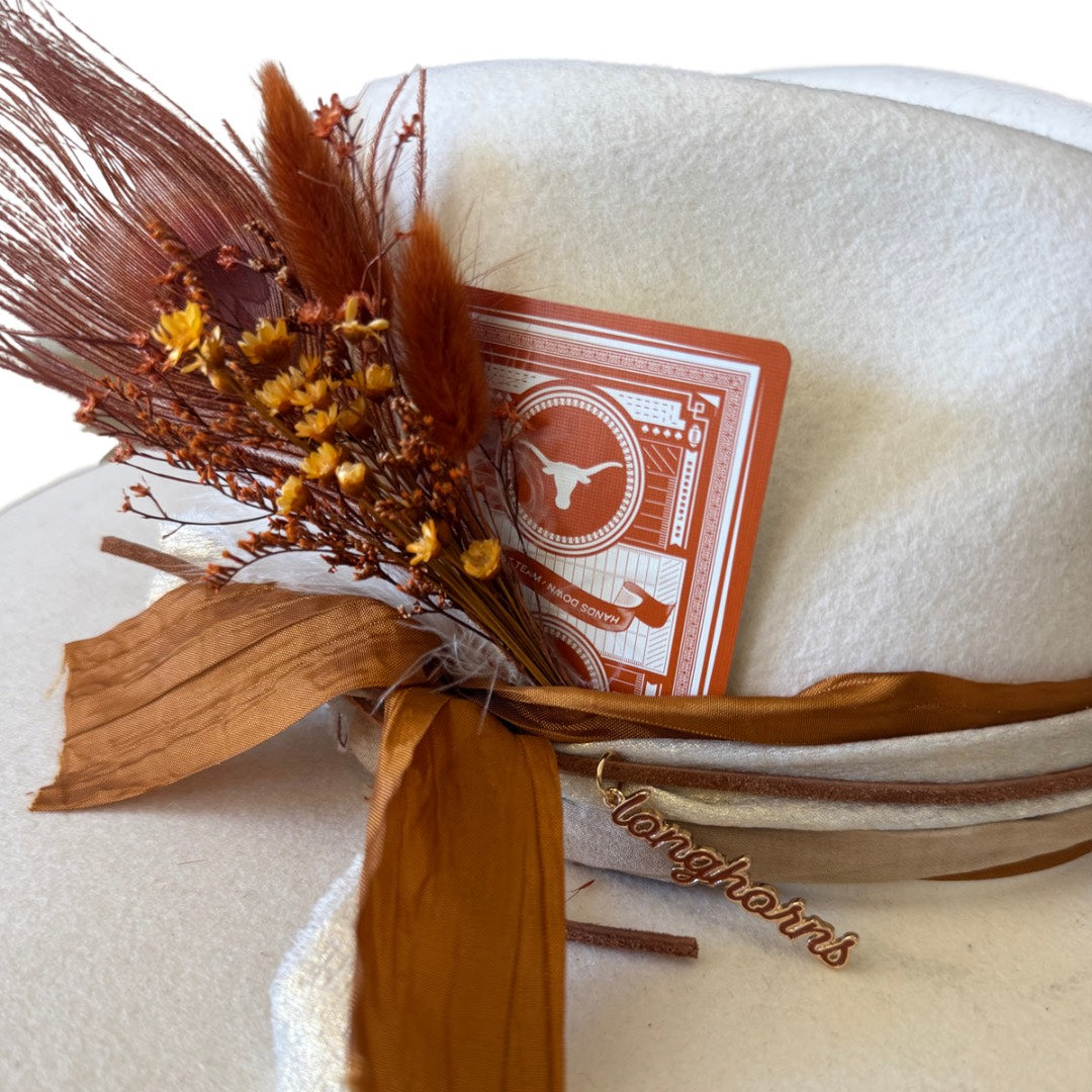 White wool fedora adorned with burnt orange taffeta, gold scrunched chiffon, a wrap of cognac suede, an officially licensed longhorns pendant and playing card. Gold hanging pendant off centered in the back.
